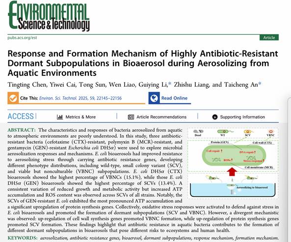 近日,广东工业大学环境健康与污染控制研究院、环境科学与工程学院安太成教授团队在气溶胶化过程中生物气溶胶的响应与形成机制方面取得最新研究进展,研究成果以《Response and Formation Mechanism of Highly Antibiotic-Resistant Dormant Subpopulations in Bioaerosol during Aerosolizing from Aquatic Environments》为题发表在Environmental Science & Technology (2025, 59(41), 22145-22156; https://doi.org/10.1021/acs.est.5c06017)期刊上。论文的第一作者为博士生陈婷婷,第二作者为博士后蔡仪威,通讯作者为安太成教授和李桂英教授。本研究作者以多种抗生素耐药大肠杆菌为研究对象,深入地阐释了水体微生物在气溶胶化过程的表型变化、生化响应特征及分子机制,揭示了耐药细菌应对气溶胶化胁迫的适应策略。结果显示:耐药大肠杆菌生物气溶胶可通过携带耐药基因增强对气溶胶化胁迫的耐受性,并形成野生型、小菌落突变体(SCV)及活的但不可培养状态细菌(VBNC)亚群等多种表型。此外,不同耐药靶点菌株的休眠亚群分布存在一定的差异。SCV亚群普遍表现出生长代谢活性降低、ATP积累及活性氧(ROS)含量增加的特征,提示其是通过激活氧化应激响应抵御环境胁迫的生存策略。进一步机制分析表明:细胞壁合成基因上调可促进VBNC亚群形成,而蛋白质合成基因上调则可以驱动SCV亚群产生。耐药细菌可通过调控相关基因表达促进气溶胶化过程中休眠亚群的形成,这些亚群可能对微生物生态系统稳定性及人类健康构成差异化风险。本研究成果可为ARB在大气环境中的传播和演化提供新的见解,有助于推进对生物气溶胶形成和抗生素耐药性传播的研究,以减少耐药性转移。